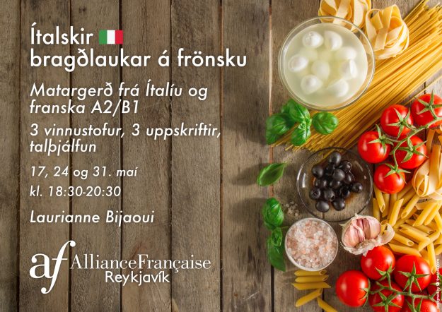 Þessu námskeiði „Ítalskir bragðlaukar á frönsku” er ætlað til að bæta við kunnáttu í frönsku með því að undirbúa og borða holla og góða rétti frá Ítalíu. Einnig uppgötva nemendur sérkenni matargerðarinnarí Ítalíu. Aðalmarkmið námskeiðsins er að bæta við kunnáttu sína í menningu í gegnum ítölsku matargerðina og með því að æfa sig í talmáli…