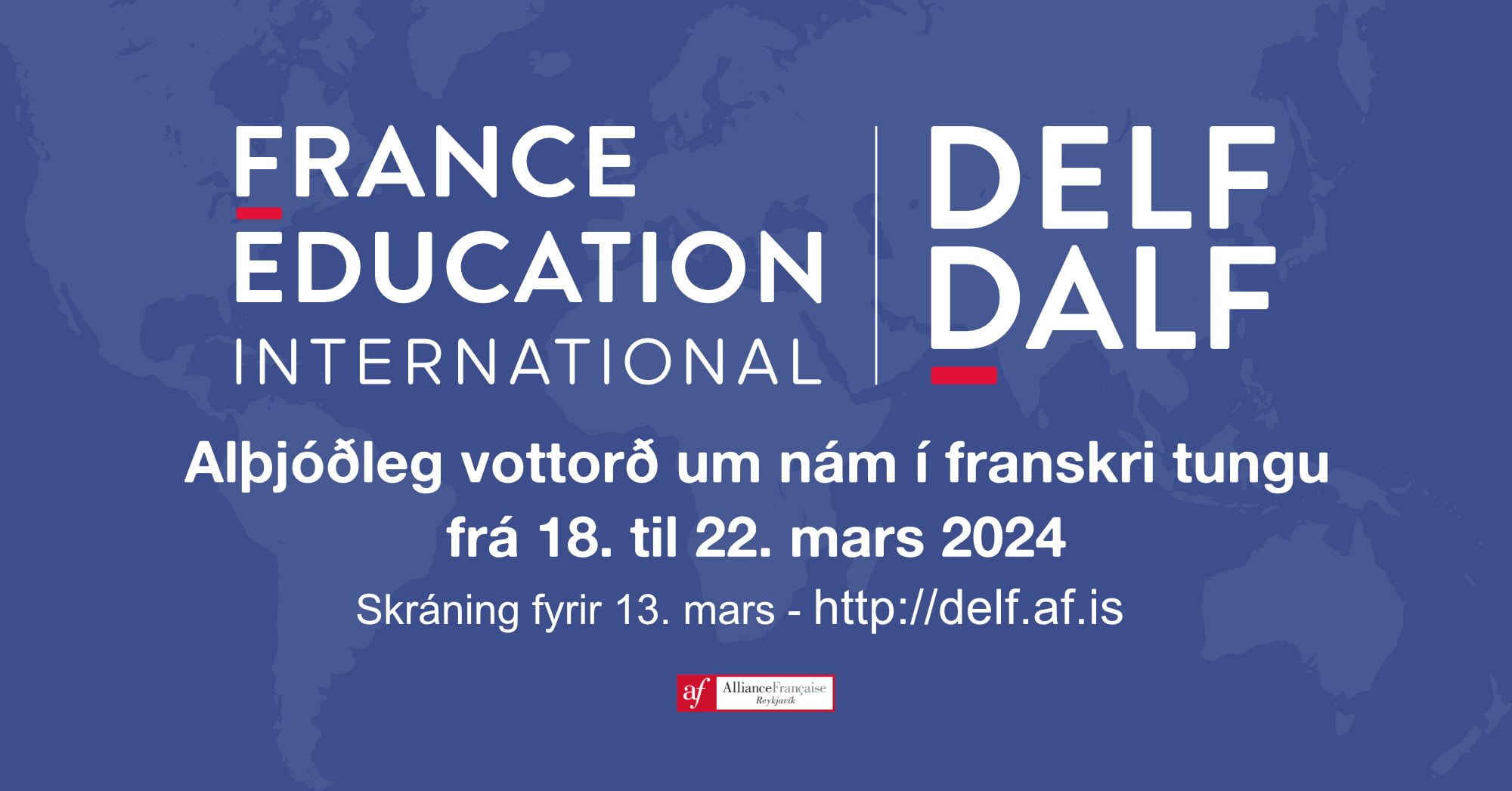 L’Alliance Française de Reykjavík propose les examens DELF-DALF tout public du 18 au 22 mars 2024 inclus.