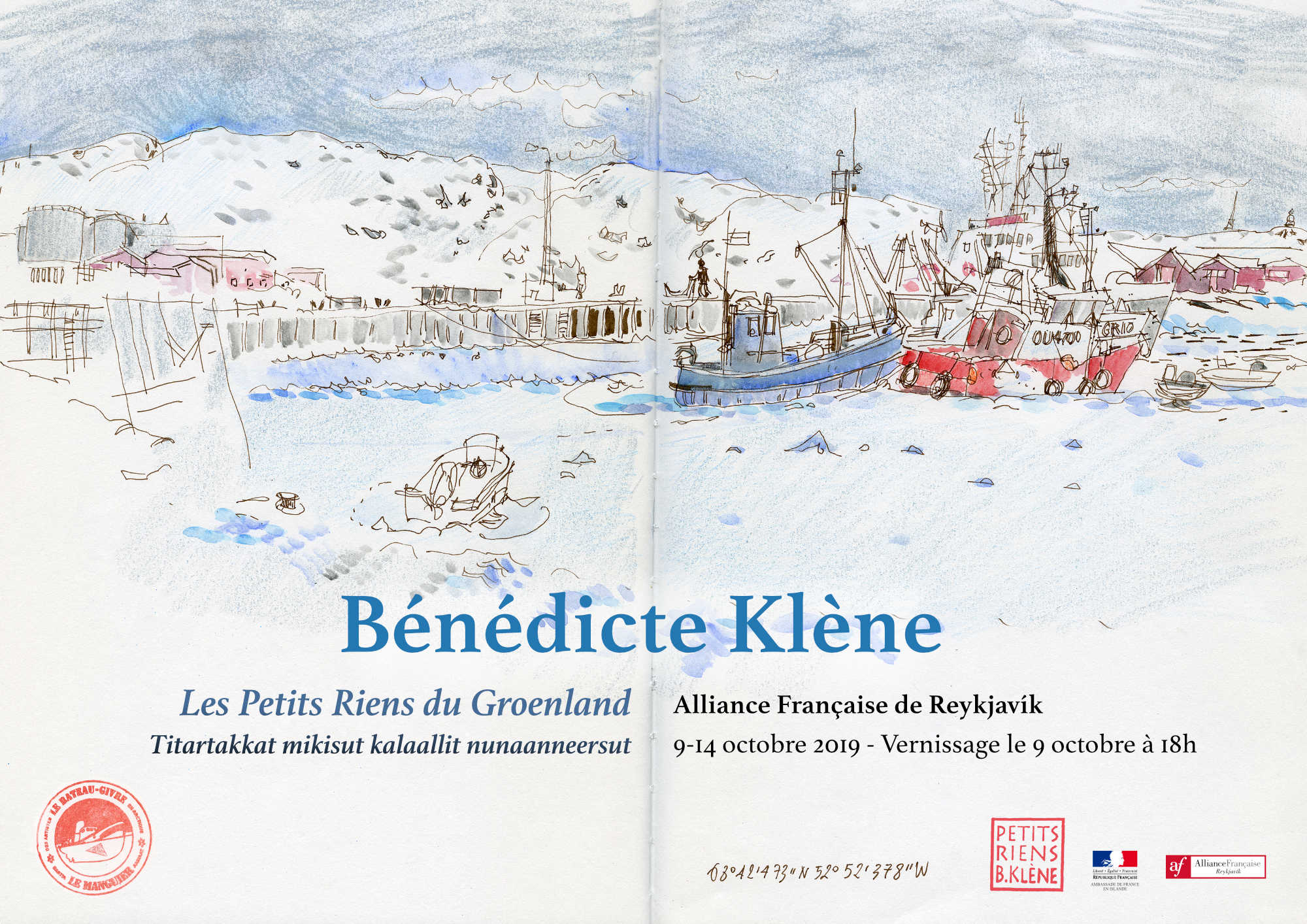 Opnun sýningarinnar eftir Bénédicte Klène, 9. október 2019, í viðurvist Kim Kielsen, forsætisráðherra Grænlands, Ségolène Royal, sendiherra Frakklands gagnvart heimskautunum, Graham Paul, sendiherra Frakklands á Íslandi og Guðlaugar M Jakobsdóttur, forseta Alliance Française í Reykjavík.